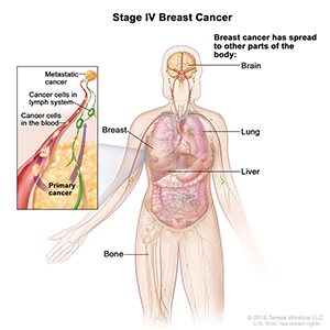 Stage IV, or metastatic, breast cancer, characterizes breast cancer cells that have spread from the breast and/or axillary lymph nodes to other parts of the body. The most common sites of metastatic breast cancer are bone, liver, lungs, and brain.
